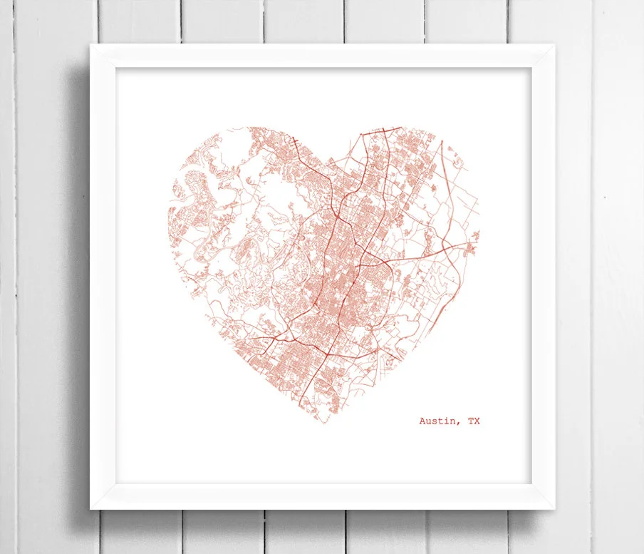 Show your love for your city with this heart shaped map of Austin, Texas.