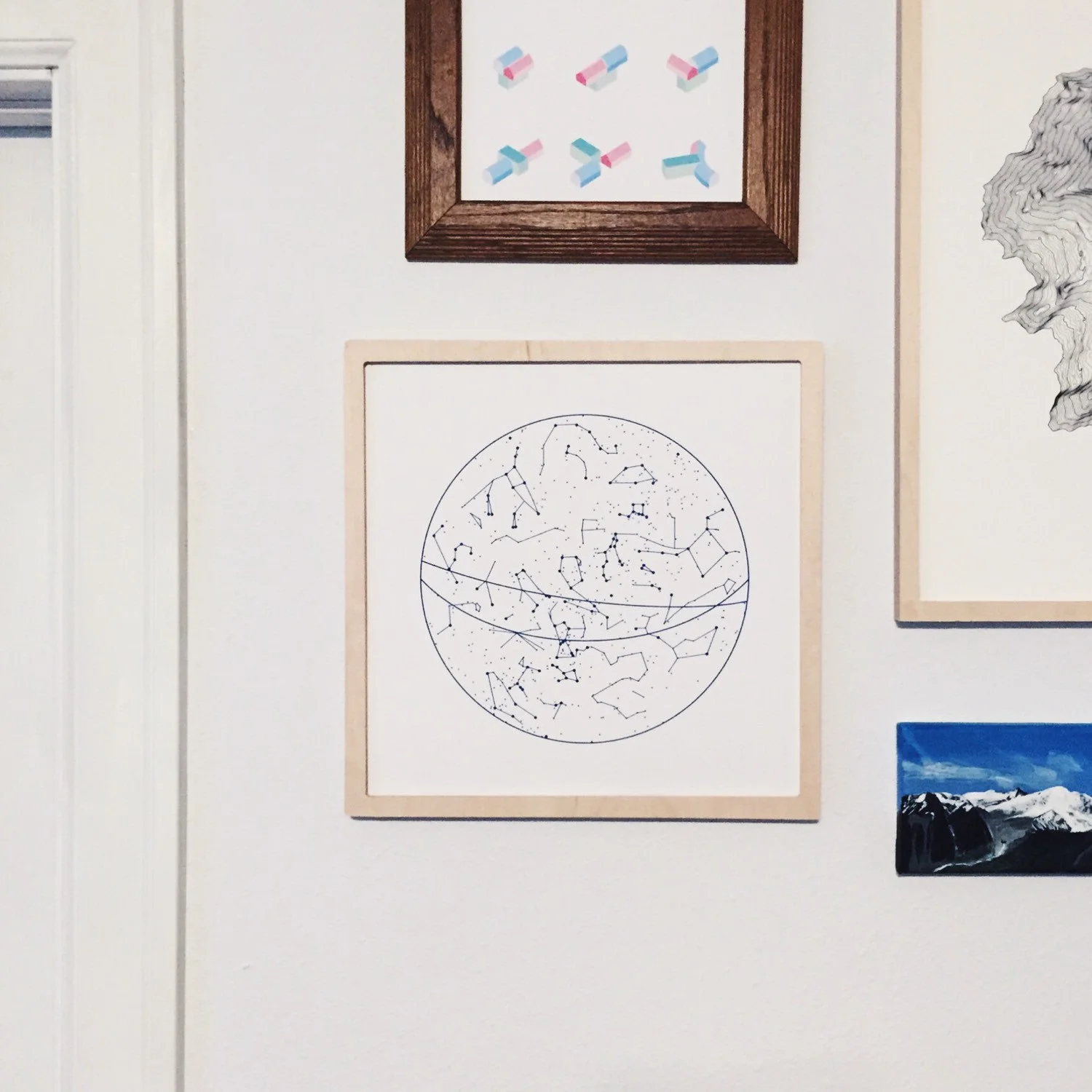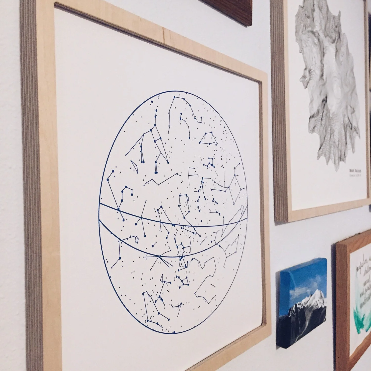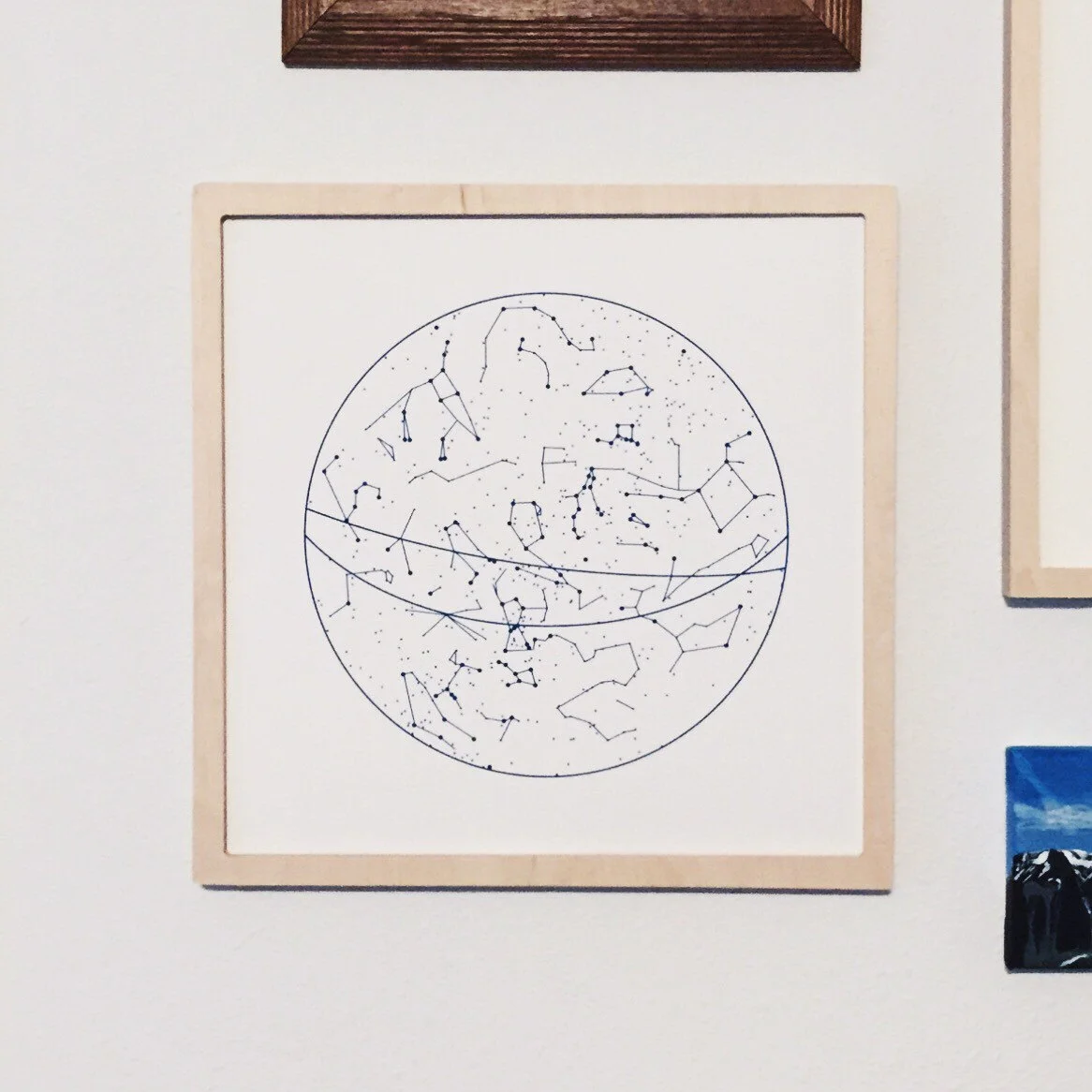 Celestial chart of the Northern Hemisphere showing the constellations, celestial equator, and the ecliptic. Dark blue ink.